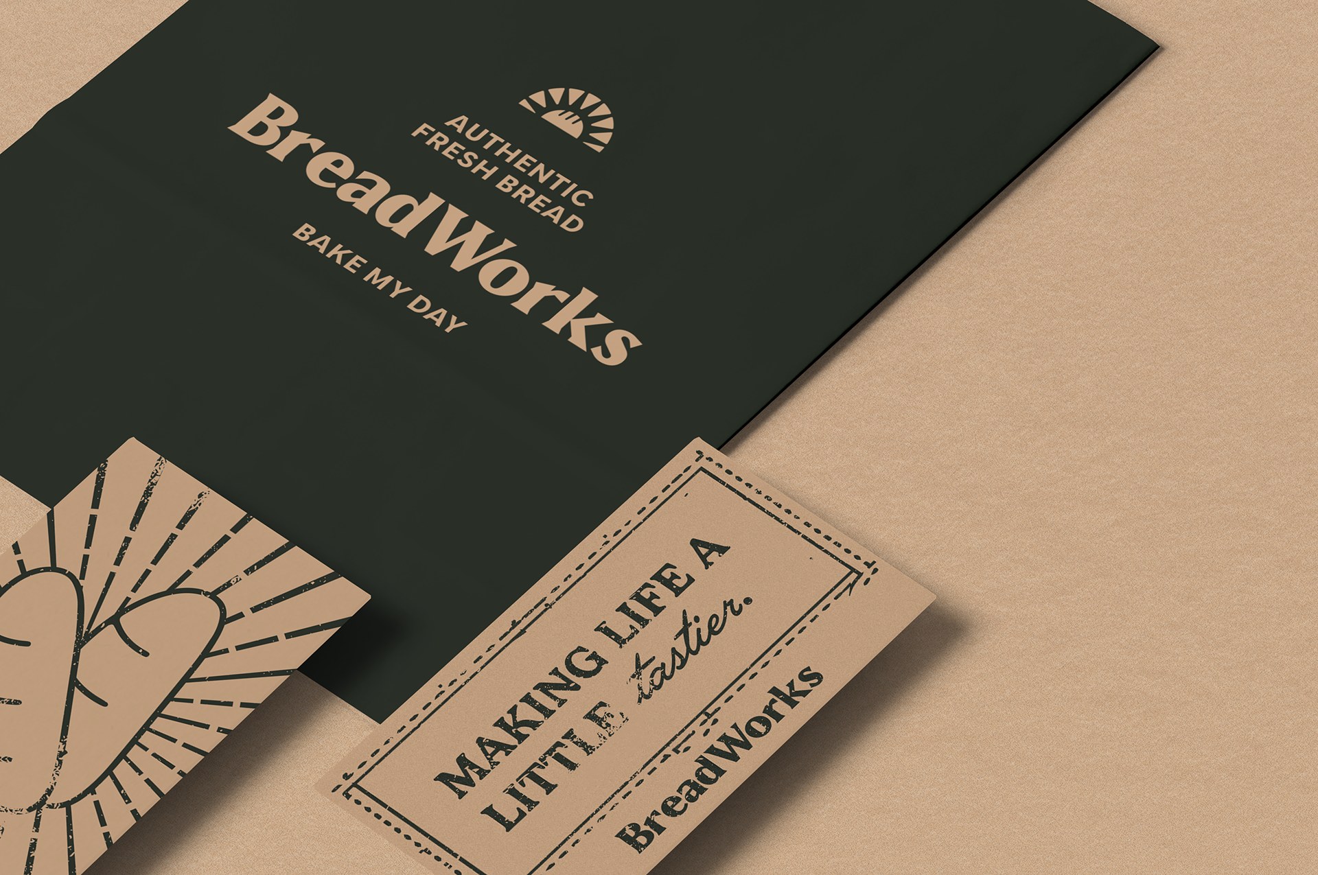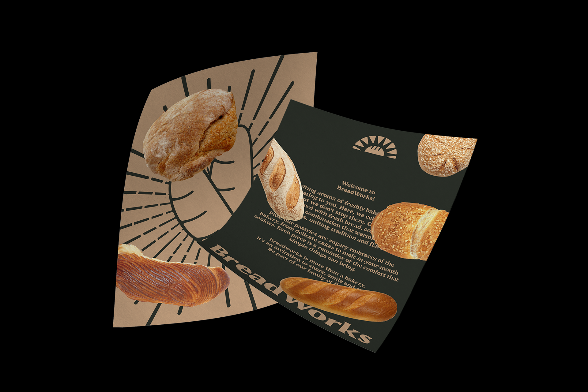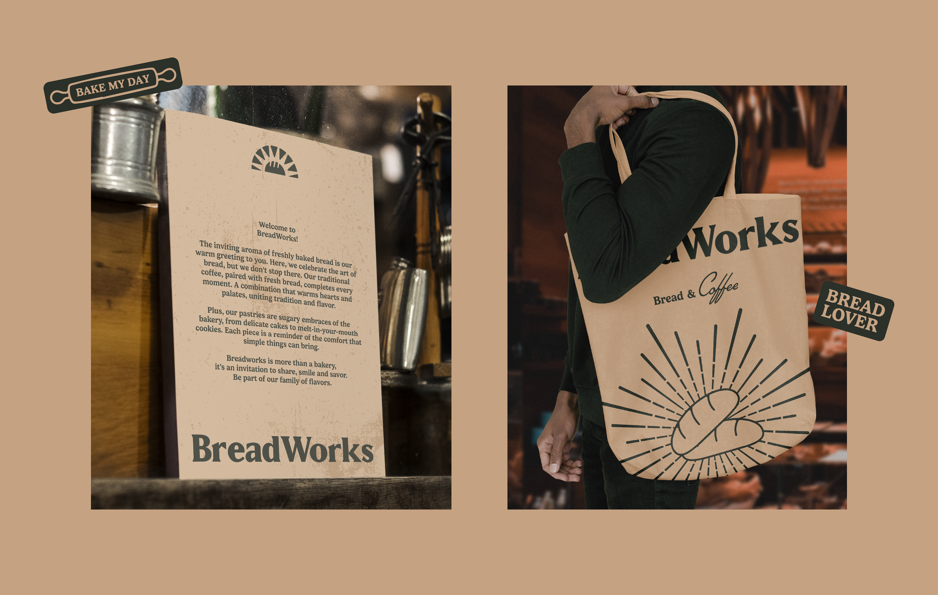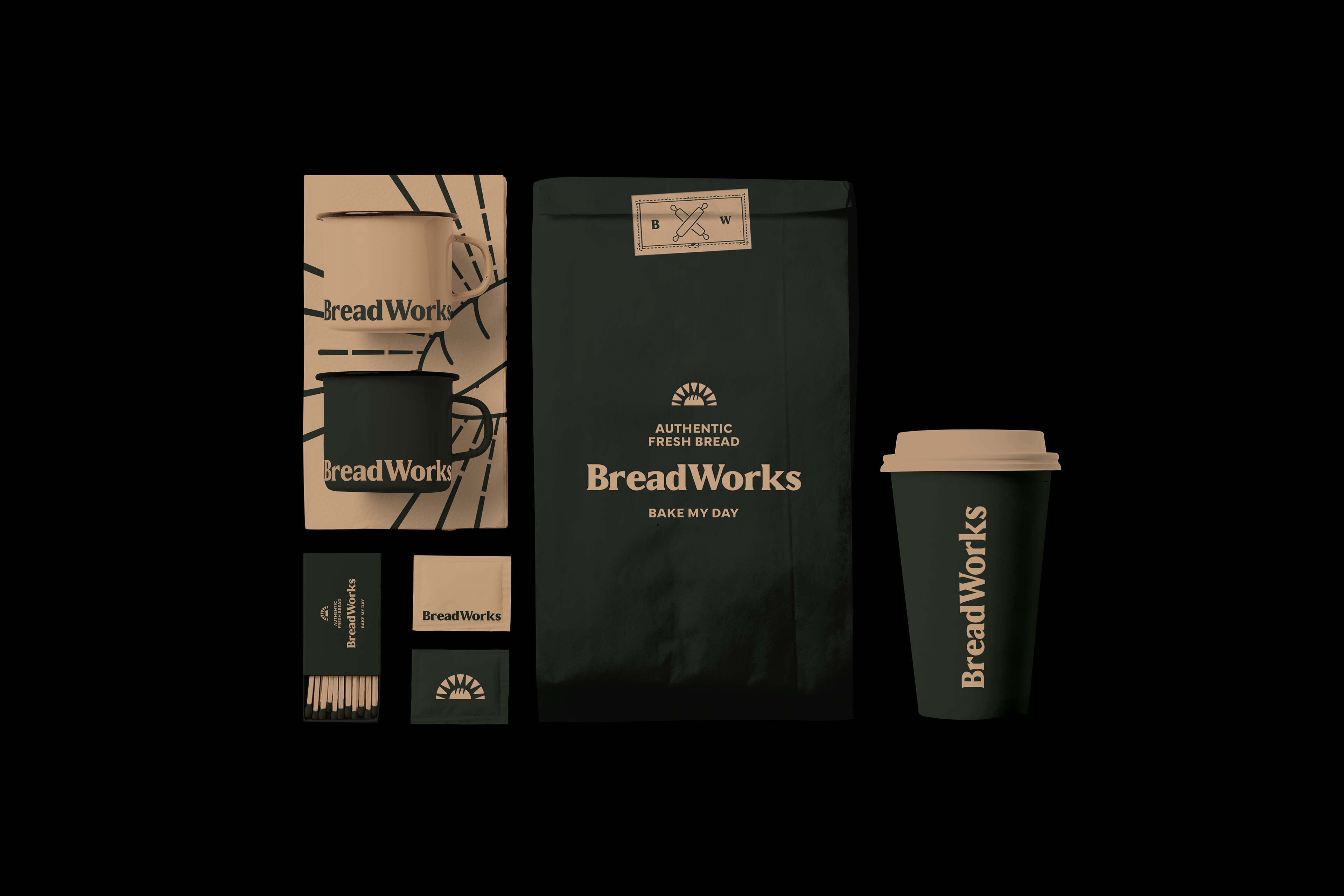 Our effort to bring a new visual identity to Breadworks wasn't just aesthetic, it was transformative. The chosen color palette evokes the warm and familiar feeling of a traditional bakery, where everyone is welcomed with open arms. The green and beige hues so familiar at Breadworks flow gracefully into our packaging and visual elements. The symbol is bread and a sun intertwined, it's not just a visual landmark; it carries the message, represents the tagline "bake my day" - an invitation for each person to allow our food to brighten their day. Furthermore, it embodies the beauty of a new dawn, where the rising sun inspires everyone to wake up and embrace the joy of a full breakfast.