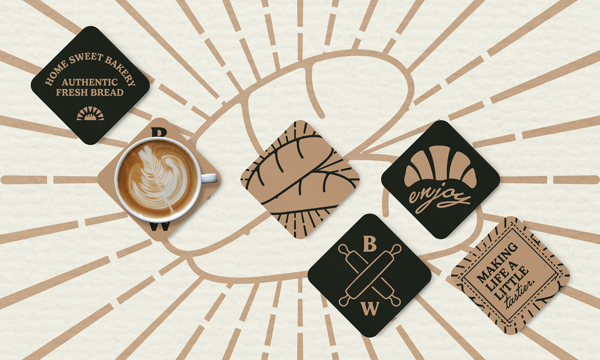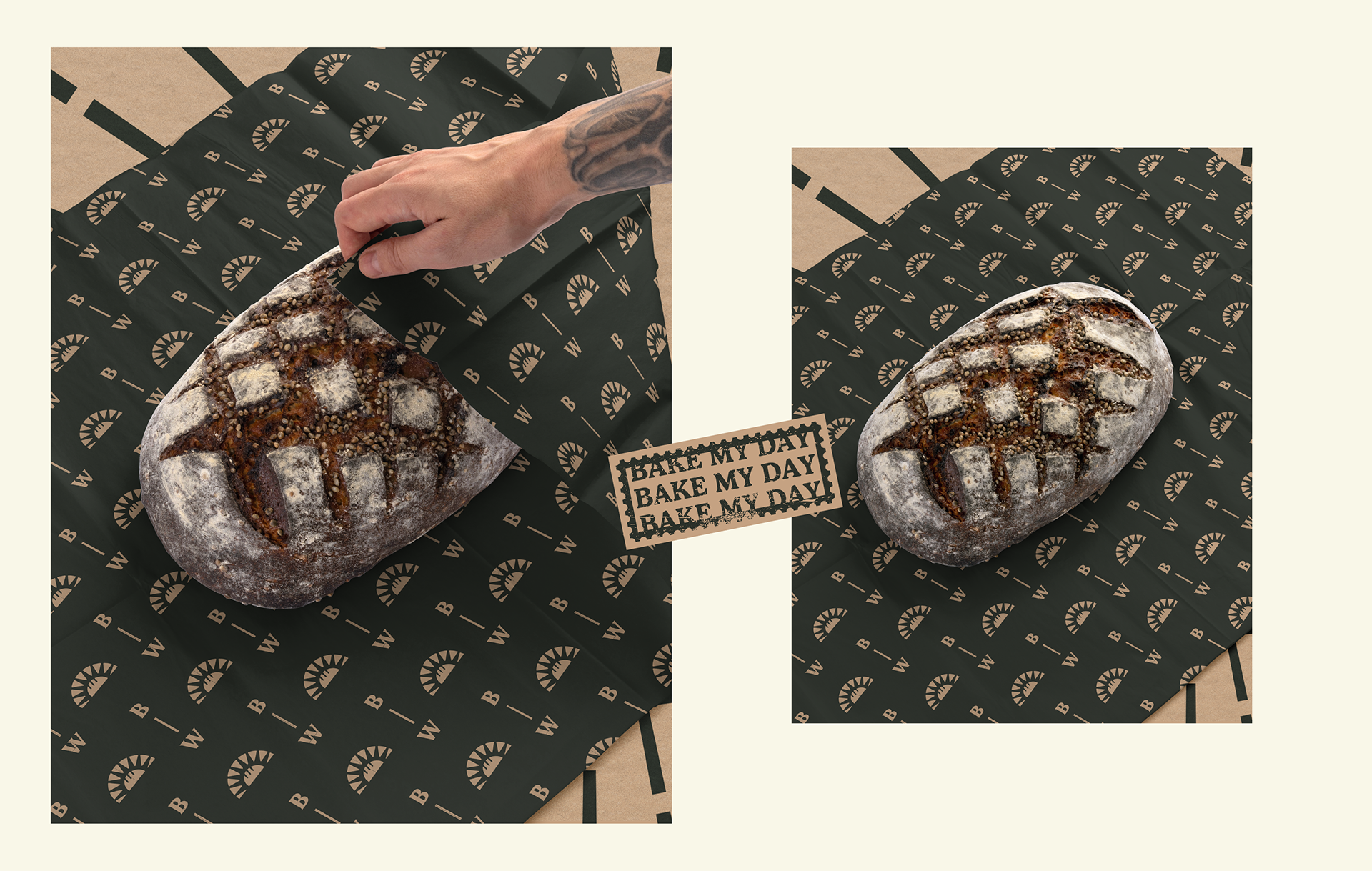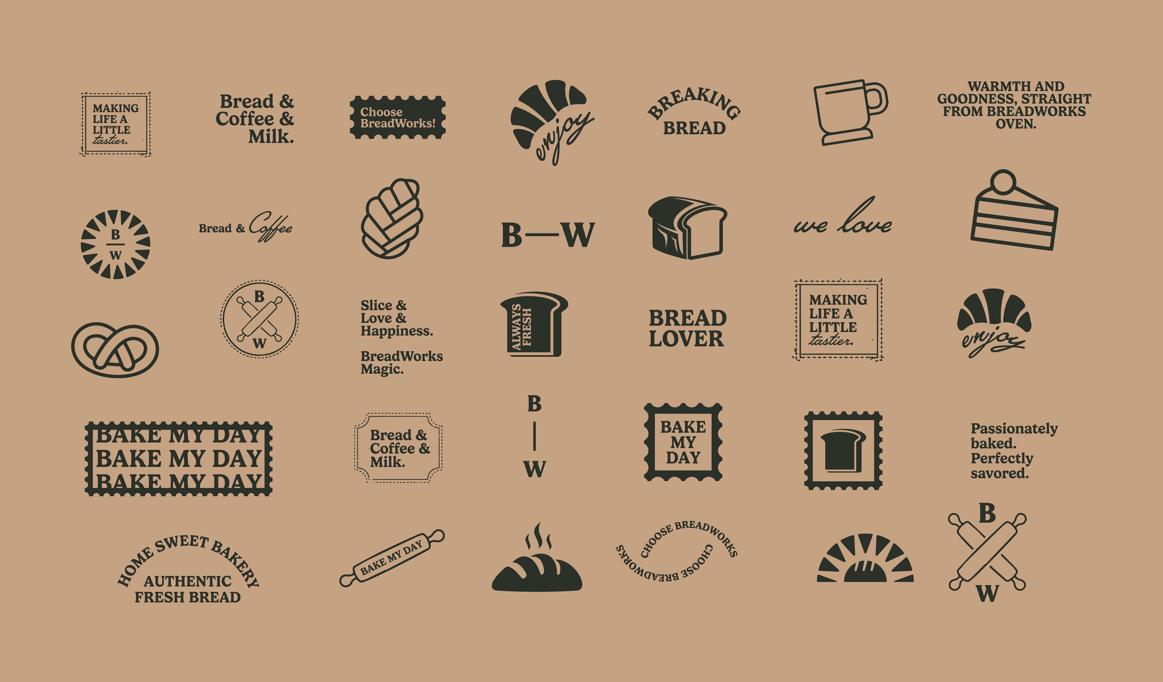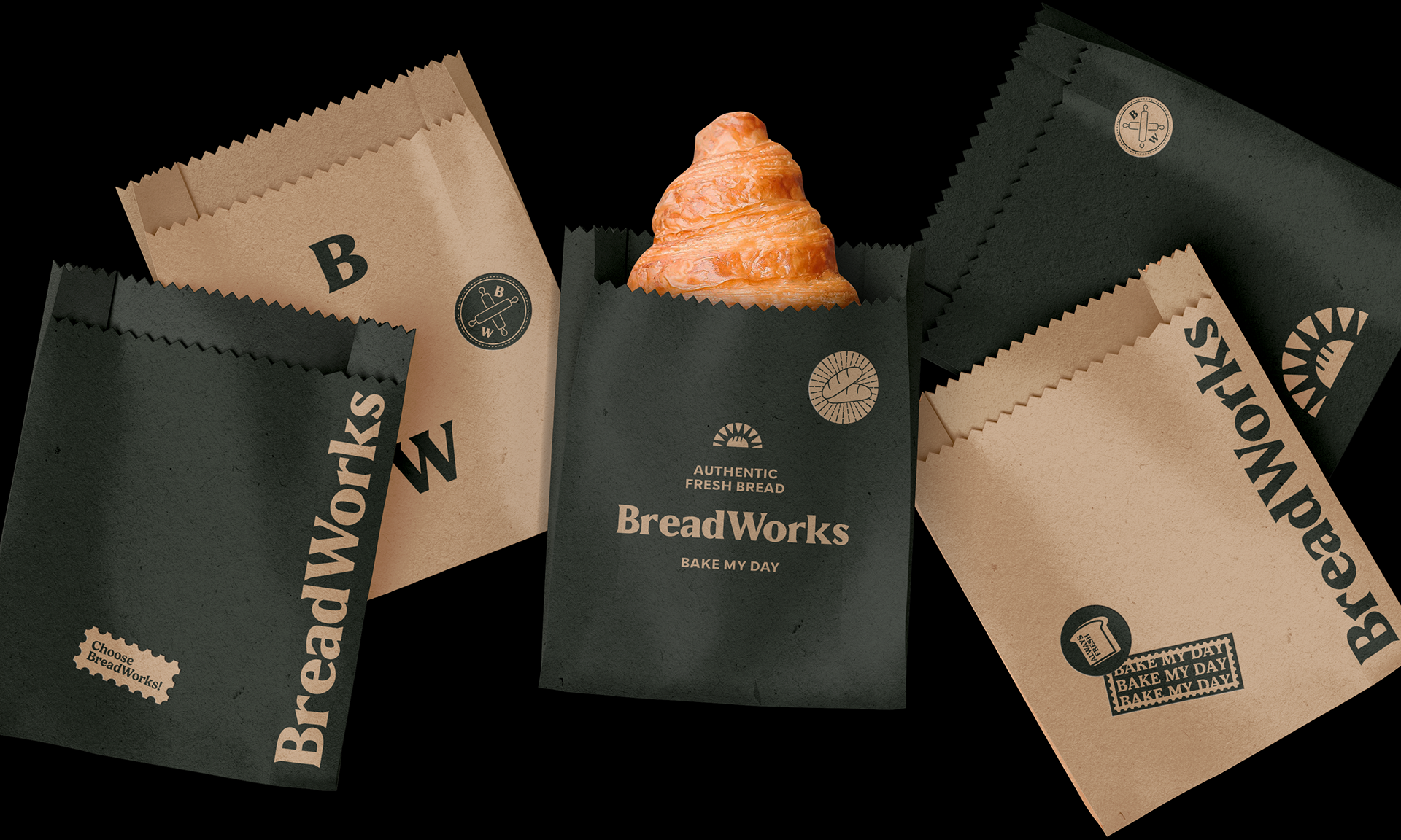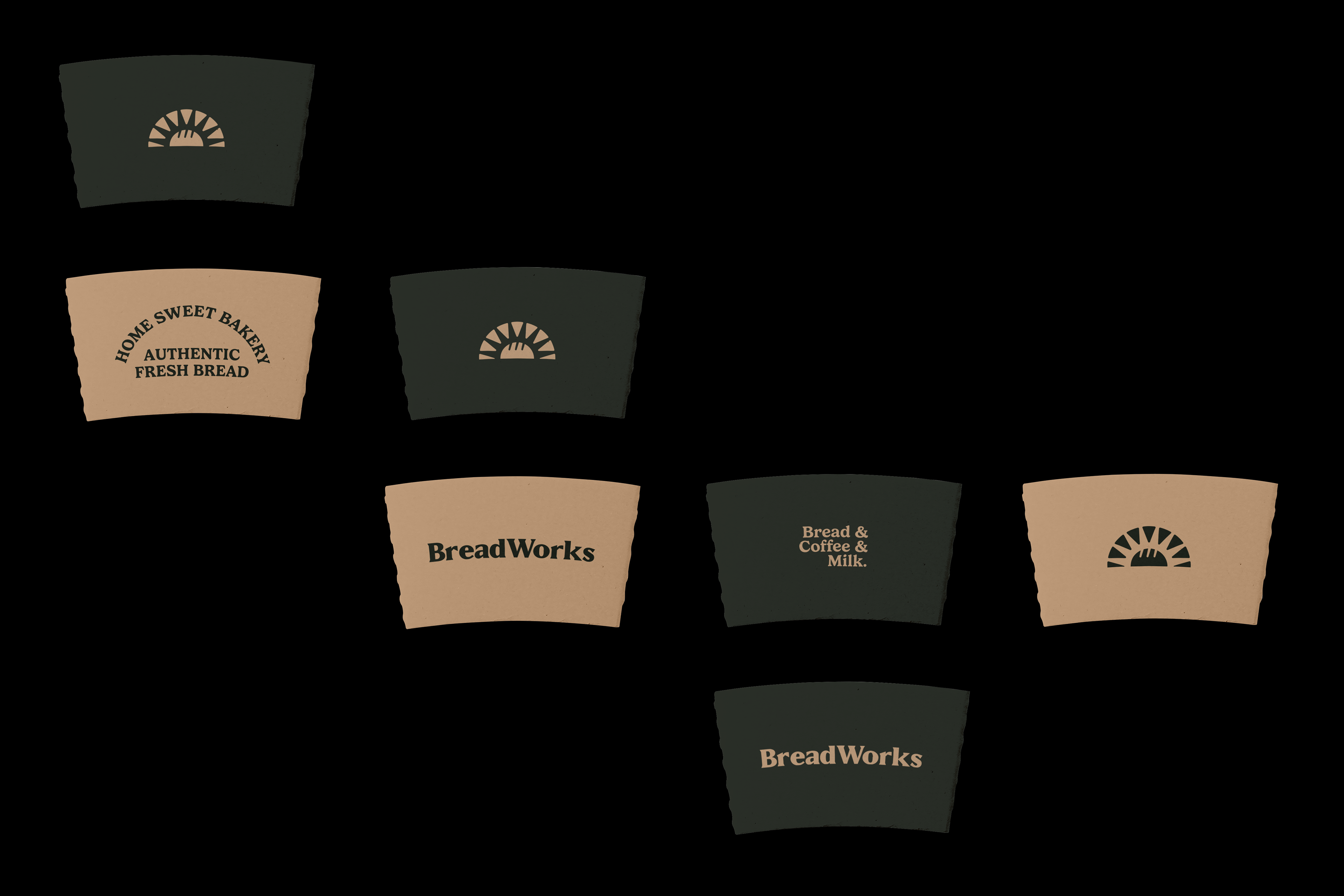 Our effort to bring a new visual identity to Breadworks wasn't just aesthetic, it was transformative. The chosen color palette evokes the warm and familiar feeling of a traditional bakery, where everyone is welcomed with open arms. The green and beige hues so familiar at Breadworks flow gracefully into our packaging and visual elements. The symbol is bread and a sun intertwined, it's not just a visual landmark; it carries the message, represents the tagline "bake my day" - an invitation for each person to allow our food to brighten their day. Furthermore, it embodies the beauty of a new dawn, where the rising sun inspires everyone to wake up and embrace the joy of a full breakfast.